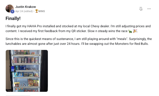 Building a successful vending business with consistent support from the VP community.
